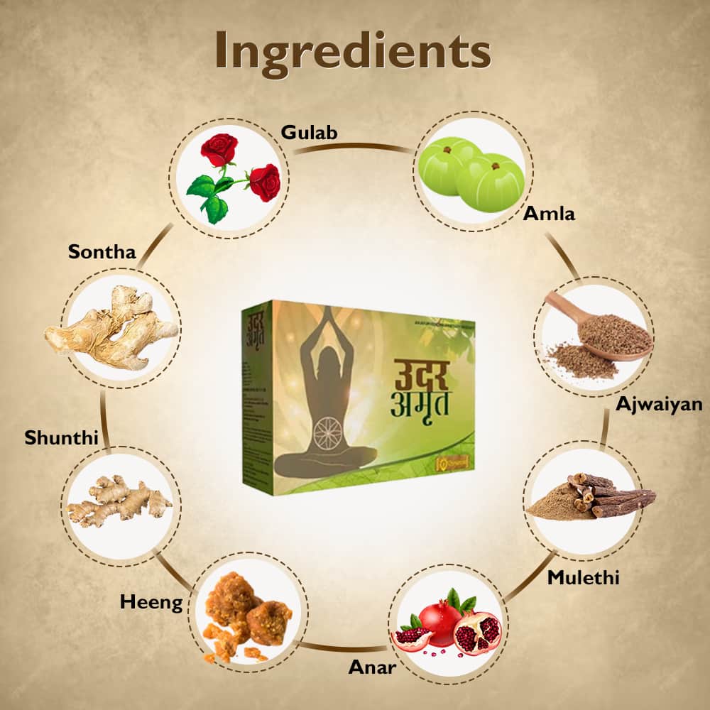 Udar Amrit is a highly effective Ayurvedic medicine containing Powder, Syrup, and Capsules. Its unique blend of carefully selected ingredients provides relief from abdominal or stomach problems such as constipation, indigestion, acidity, gas, bloating, abdominal pain, nausea, and excessive burping, which can negatively impact daily life and cause discomfort.
