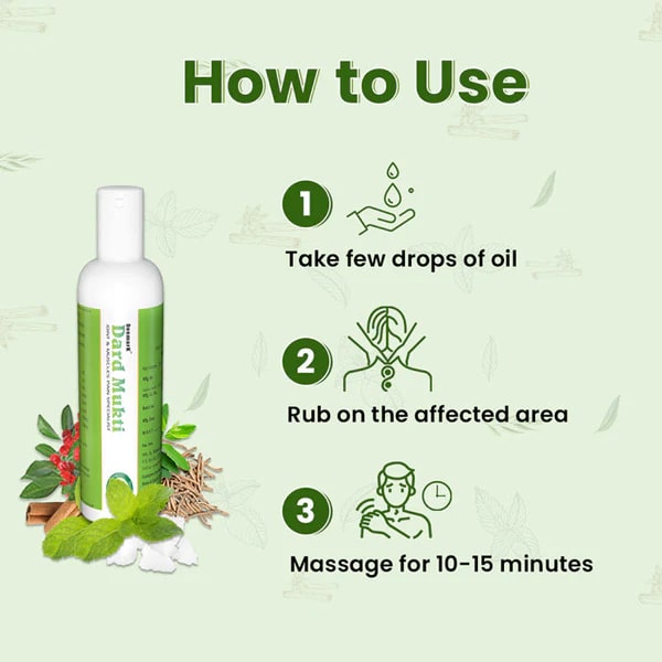 Deemark Dard Mukti Oil uses natural ingredients such as Tejpatta and Seasame Oil for pain relief. To use Deemark Dard Mukti Oil effectively, it is recommended to apply it on clean and dry skin, and massage it gently into the affected area. It is also important to avoid getting it in the eyes or on open wounds, and to wash hands thoroughly after use. Additionally, it is recommended to maintain a healthy lifestyle and to seek medical advice if the pain persists or worsens.Ā