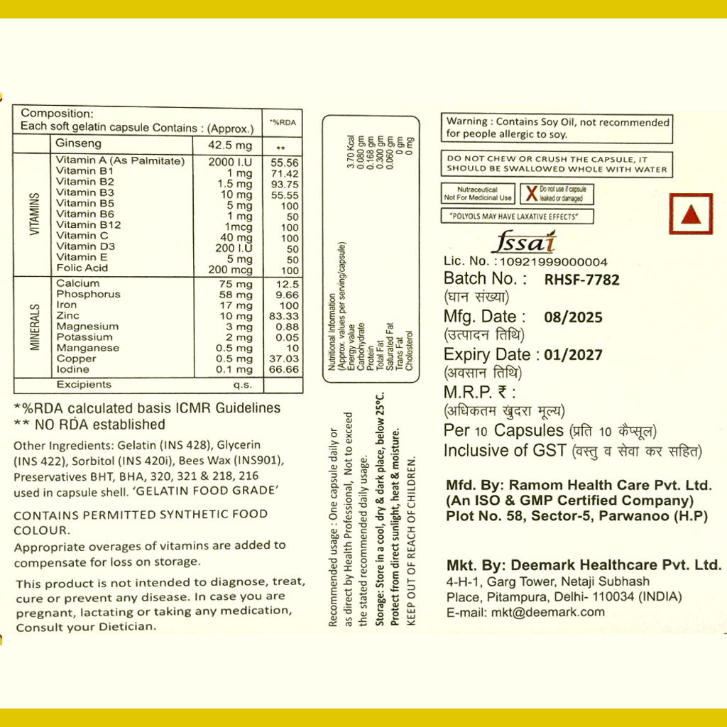 Formulated for both men and women, Deemark Multivitamin Soft Gel Capsules are made in GMP- and ISO-certified facilities, ensuring high quality, purity, and safety with every dose.