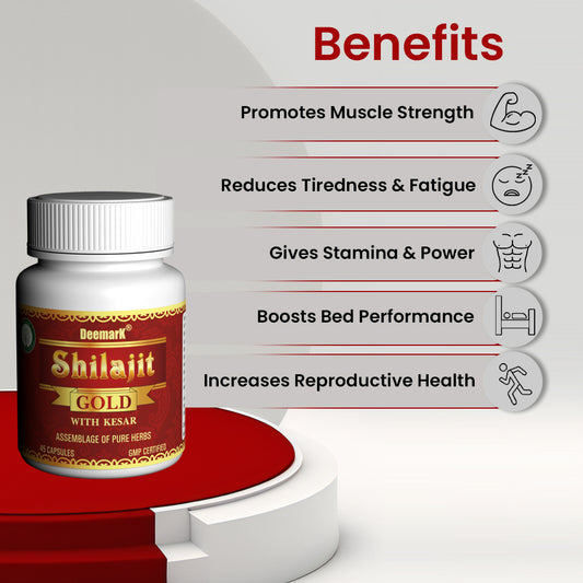 Deemark's Shilajit Gold Capsules are an energy enhancement wellness product based on ayurvedic principles. These capsules are designed to boost energy, strength and vitality. The main ingredient in these capsules is Shilajit, which comes from the Himalayas. It's known for its benefits like improving stamina, and helping with fertility.